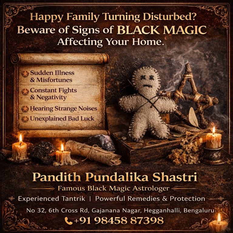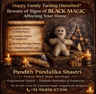 Pandith Pundalika Shastri is a famous and trusted black magic astrologer in Bangalore, known for his deep knowledge of Vedic astrology, traditional spiritual practices, and years of experience in providing astrology-based guidance. Many individuals and families approach him when they face continuous life disturbances, emotional stress, family problems, or unexplained negative situations. People searching online for a best black magic astrologer in Bangalore often consult Pandith Pundalika Shastri for clarity, peace of mind, and spiritual direction.