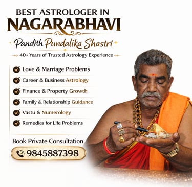 If you are searching for the best astrologer in Nagarabhavi, Pandith Pundalika Shastri is widely known for providing reliable astrology guidance and spiritual consultation. With over 40 years of experience in astrology, he has helped many individuals and families understand their life path through traditional Vedic astrology methods. His approach focuses on spiritual guidance, horoscope analysis, and practical suggestions that help people make better life decisions.
