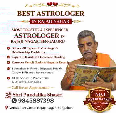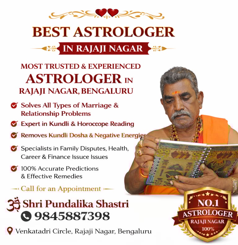 If you are searching for the best astrologer in Rajaji Nagar, Shri Pundalika Shastri offers reliable and traditional astrology guidance for individuals and families in Rajaji Nagar, Bengaluru. With years of experience in Vedic astrology, he provides personalized consultations based on horoscope analysis, kundli reading, and planetary positions.