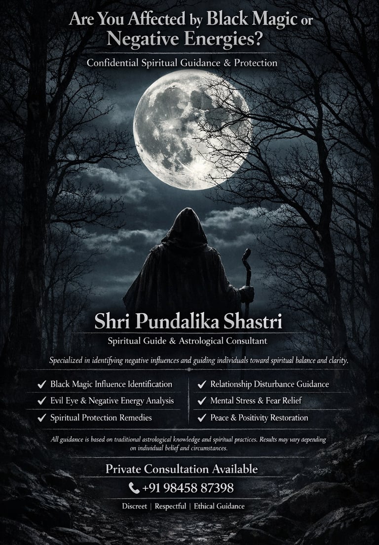Many individuals experience unexplained challenges in life such as constant stress, relationship disturbances, fear, lack of peace, or a sudden imbalance in personal and professional matters. In traditional Indian belief systems, these concerns are often associated with negative energies or external spiritual influences. At Shri Pundalika Shastri’s Spiritual Guidance Centre in Nagarabhavi, Bengaluru, individuals receive confidential, ethical, and belief-based astrological guidance to understand and address such concerns with clarity and calmness.