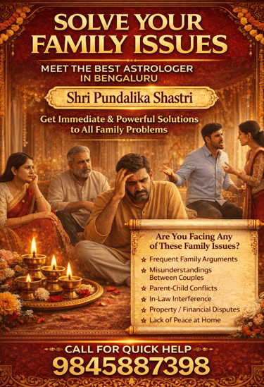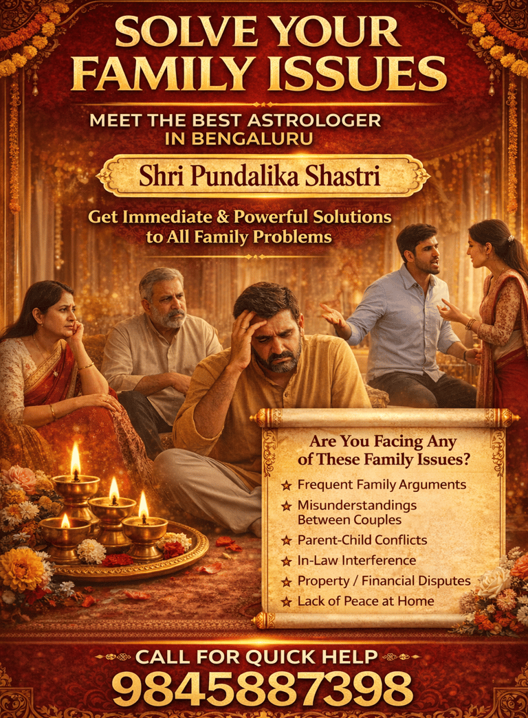 Family life is the foundation of emotional well-being, yet many families today face ongoing challenges that disturb peace and harmony at home. Disagreements between couples, misunderstandings among family members, parent-child conflicts, and property or financial disputes can create long-term stress if not addressed properly. If you are looking for trusted guidance to understand and manage such issues, Shri Pundalika Shastri, a well-known astrologer in Bengaluru, offers structured astrological consultation focused on family-related concerns.