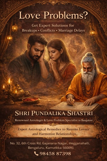 With years of experience in Vedic astrology, horoscope analysis, and relationship counseling through astrological methods, Shri Pundalika Shastri provides personalized consultations based on birth charts and planetary positions. Many individuals from Rajajinagar, Mahalakshmi Layout, Basaveshwaranagar, Malleswaram, and surrounding areas approach him for guidance related to love marriage issues, breakup concerns, family opposition, trust issues, and emotional instability in relationships.