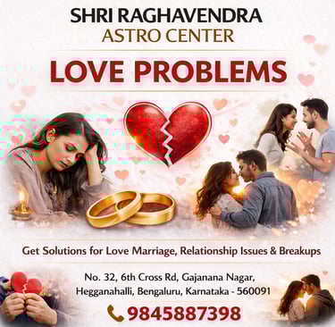 Love and relationships play a vital role in our emotional well-being, yet many individuals and couples face challenges such as misunderstandings, emotional distance, family pressure, or uncertainty about marriage. At Shri Raghavendra Astro Center, we provide traditional astrological guidance for individuals seeking clarity and direction in their love life and relationships in Bangalore.