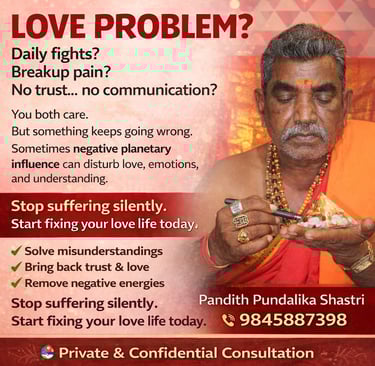 Pandith Pundalika Shastri, a trusted love problem specialist in Nagarabhavi, provides spiritual guidance and traditional astrological solutions for relationship challenges. With years of experience in astrology consultation, he helps individuals and couples understand the root cause of their problems through detailed horoscope analysis and planetary study.