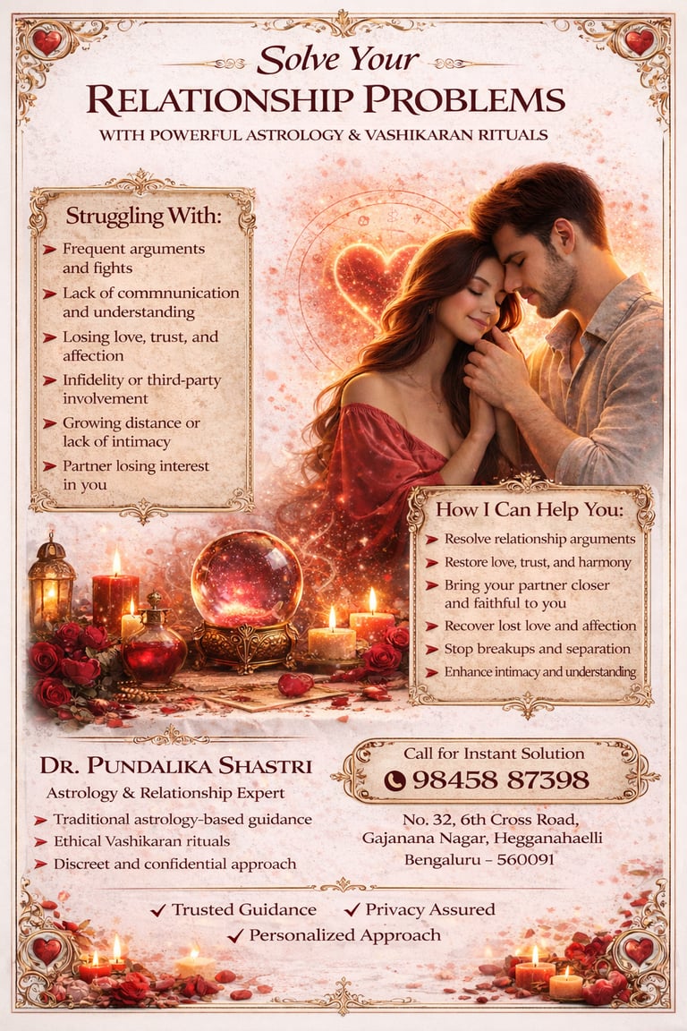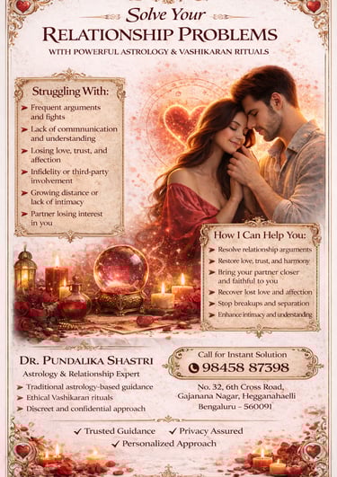 If you are looking for relationship problem guidance in Rajajinagar, relationship astrology consultation in Bengaluru, or ethical astrology advice for love and marriage issues, our services are designed to offer clarity, balance, and emotional support.
